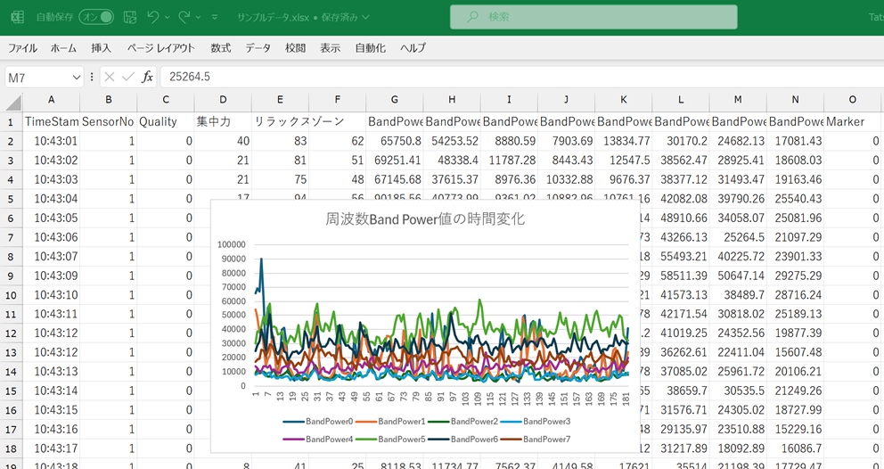 推奨脳波計を接続することで、リアルタイムに脳波を測定し、α波・β波などの周波数バンドを自動で解析。